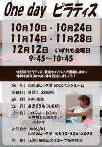 【日 時】 10月10日、10月24日、11月14日、11月28日、12月12日(いずれも金曜日)9:45~10:45 【場 所】 和歌山ビッグ愛 6階スポシンルーム 【参加料】 各回 1,200円 【講 師】 kako先生 【定 員】 各25名(先着順) 【持ち物】 ヨガマット、飲み物 【お問合せ・お申込み】 和歌山ビッグ愛 ℡.073-435-5200