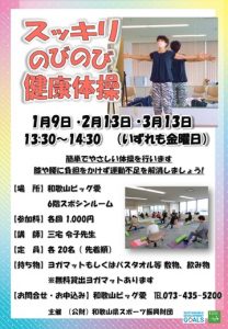 【日 時】1月9日、2月13日、3月13日(いずれも金曜日)13:30~14:30 【場 所】和歌山ビッグ愛 6階スポシンルーム 【参加料】各回1,000円 【講 師】三宅 令子先生 【定 員】各回20名(先着順) 【持ち物】ヨガマットもしくはバスタオル等の敷物、水分補給用の飲物 【お問合せ・お申込み】 和歌山ビッグ愛 ℡.073-435-5200