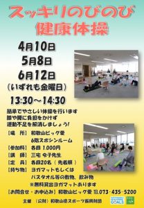 【日 時】4月10日、5月8日、6月12日(いずれも金曜日)13:30~14:30 【場 所】和歌山ビッグ愛 6階スポシンルーム 【参加料】各回1,000円 【講 師】三宅 令子先生 【定 員】各回20名(先着順) 【持ち物】ヨガマットもしくはバスタオル等の敷物、水分補給用の飲物 【お問合せ・お申込み】 和歌山ビッグ愛 ℡.073-435-5200