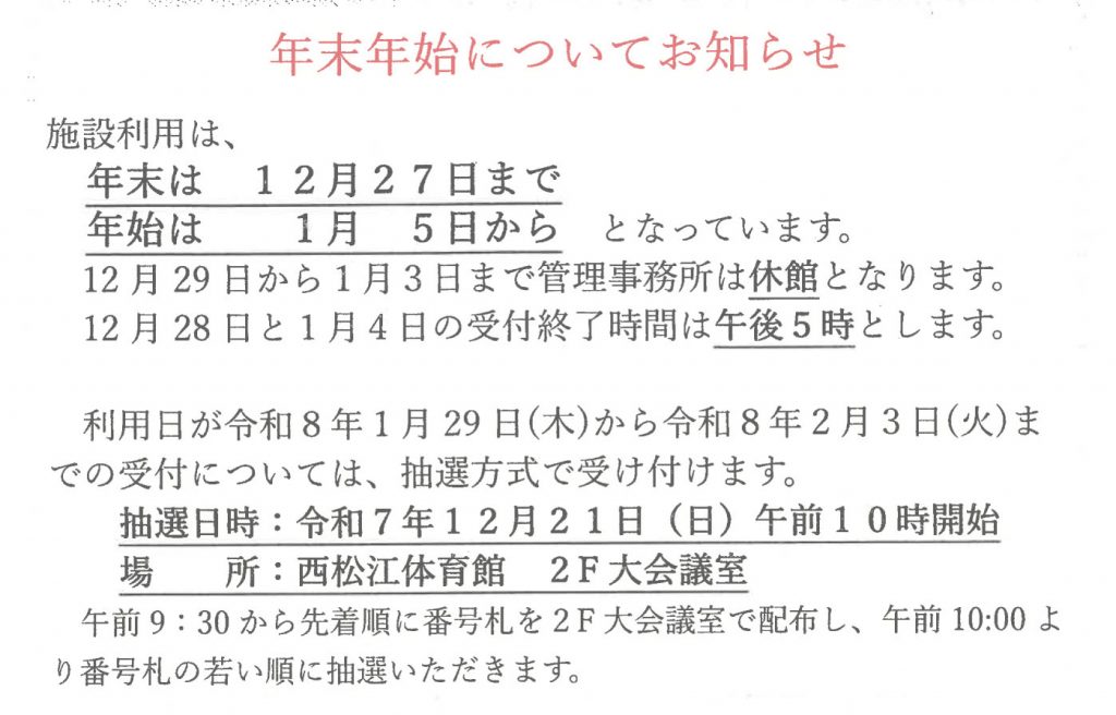 (12月29日~1月3日までの間、管理事務所が休館のため)
