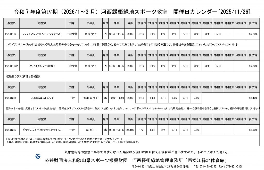 令和7年度第Ⅳ期(2026/1~3月)スポーツ教室のお知らせ